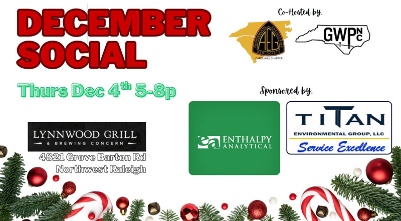 AEG/GWPNC December Social – Dec. 4, 2025 By WebEditorNovember 26, 2025December 2, 2025Meeting AEG/GWPNC December Social Date: Thursday, December 4 Time: 5-8 p.m. Location: Lynnwood Grill & Brewing Company, 4821 Grove Barton Road, Raleigh Sponsor: Enthalpy Analytical is the bar sponsor; Food/Drink provided